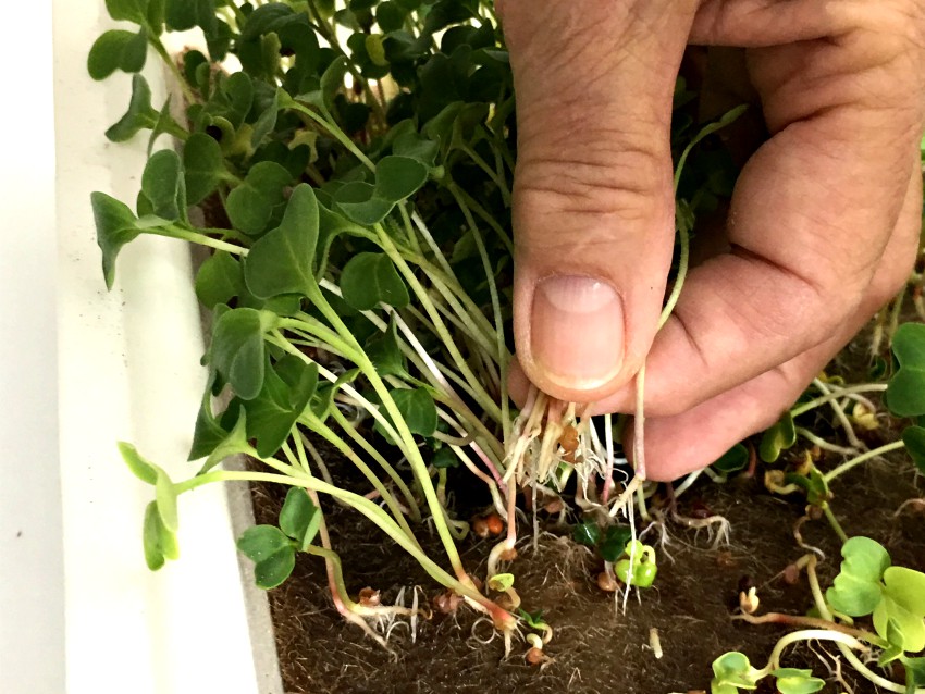Harvesting microgreens by pulling plants from jute grow mat.Pulling plants from the mat keeps most of the roots attached. Roots are edible and they add crunch and flavor.