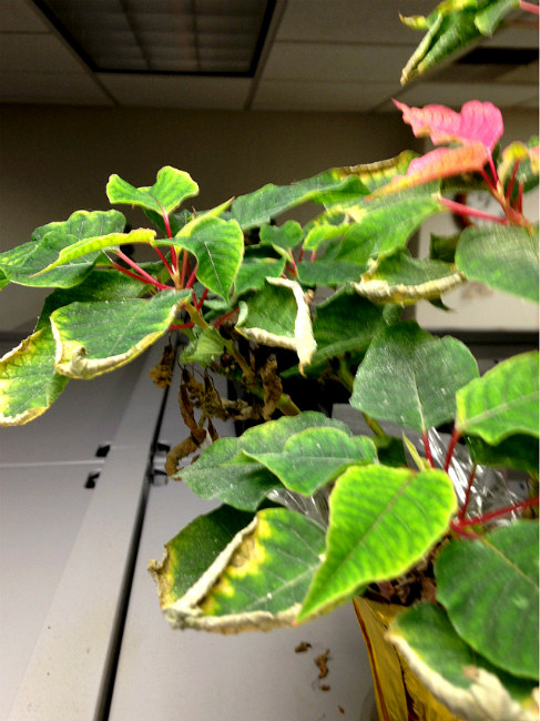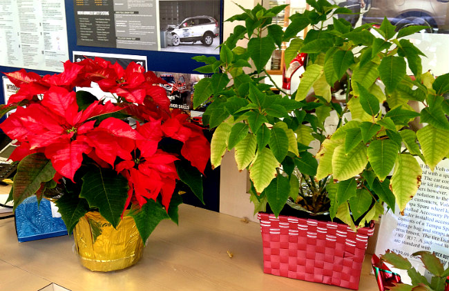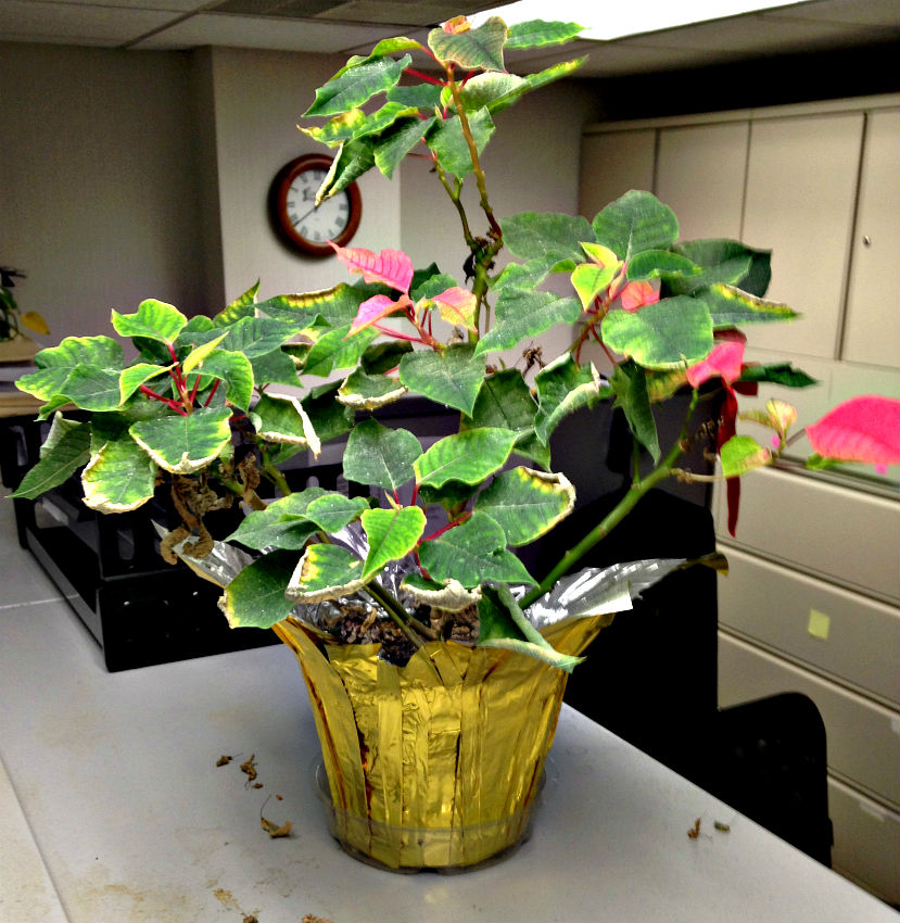 Fresh, new plant is on left - last years plant is on right.Futhermore, poinsettias are magnets for insects and that's bad news for your other plants.