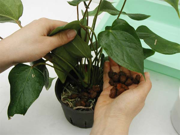 6. Position plant in new pot. Correct planting depth is important. Plant hydroponic plants slightly deeper than soil plants for stability. Fill pot with pebbles. Tap down pebbles to make sure there are no air gaps. | |